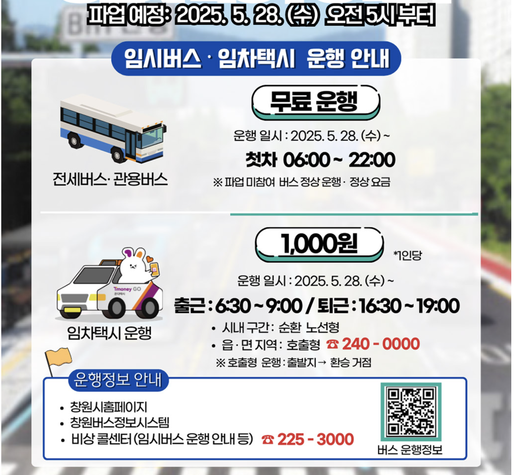- 이용 방법: 차량 앞 ‘비상수송’, ‘파업 대체버스’ 스티커 확인 후 탑승