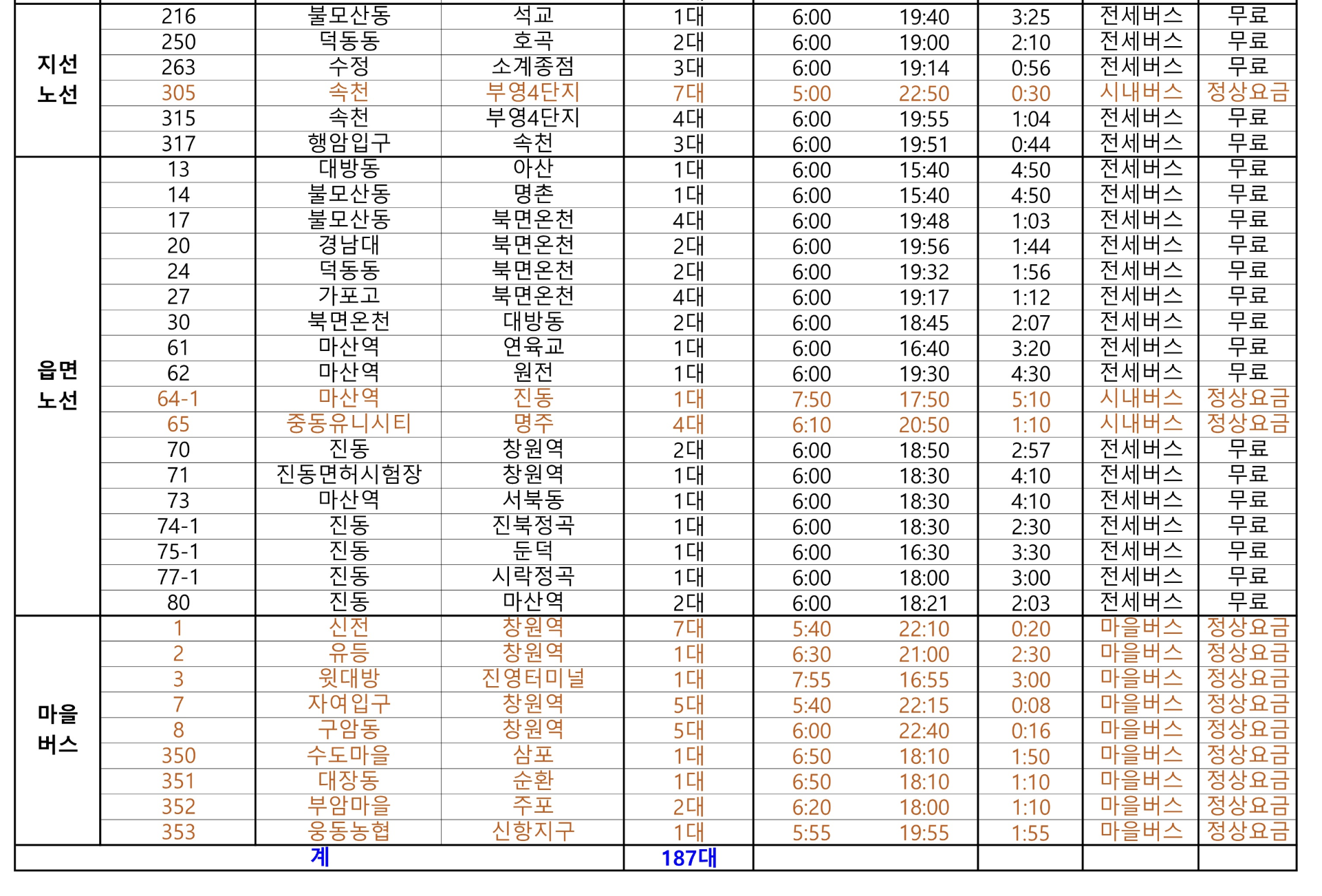 - 총 투입: 187대 (간선·지선·읍면·마을버스 포함)