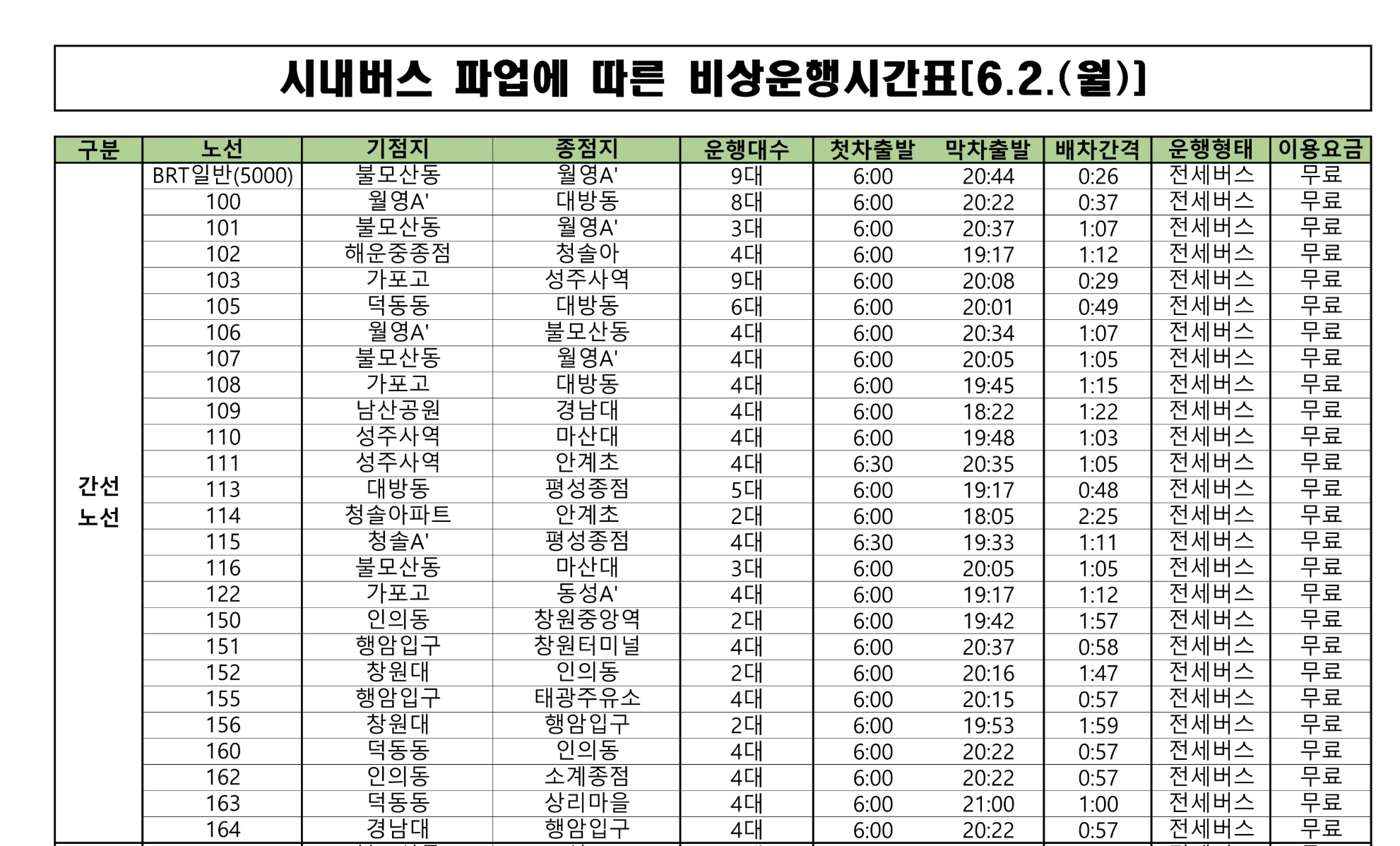 2025년 6월 2일 월요일 기준, 창원 시내버스 파업은 6일째 이어지고 있으며, 시에서 긴급 투입한 전세·관용버스와 임차택시가 대체 수단으로 운영 중입니다.