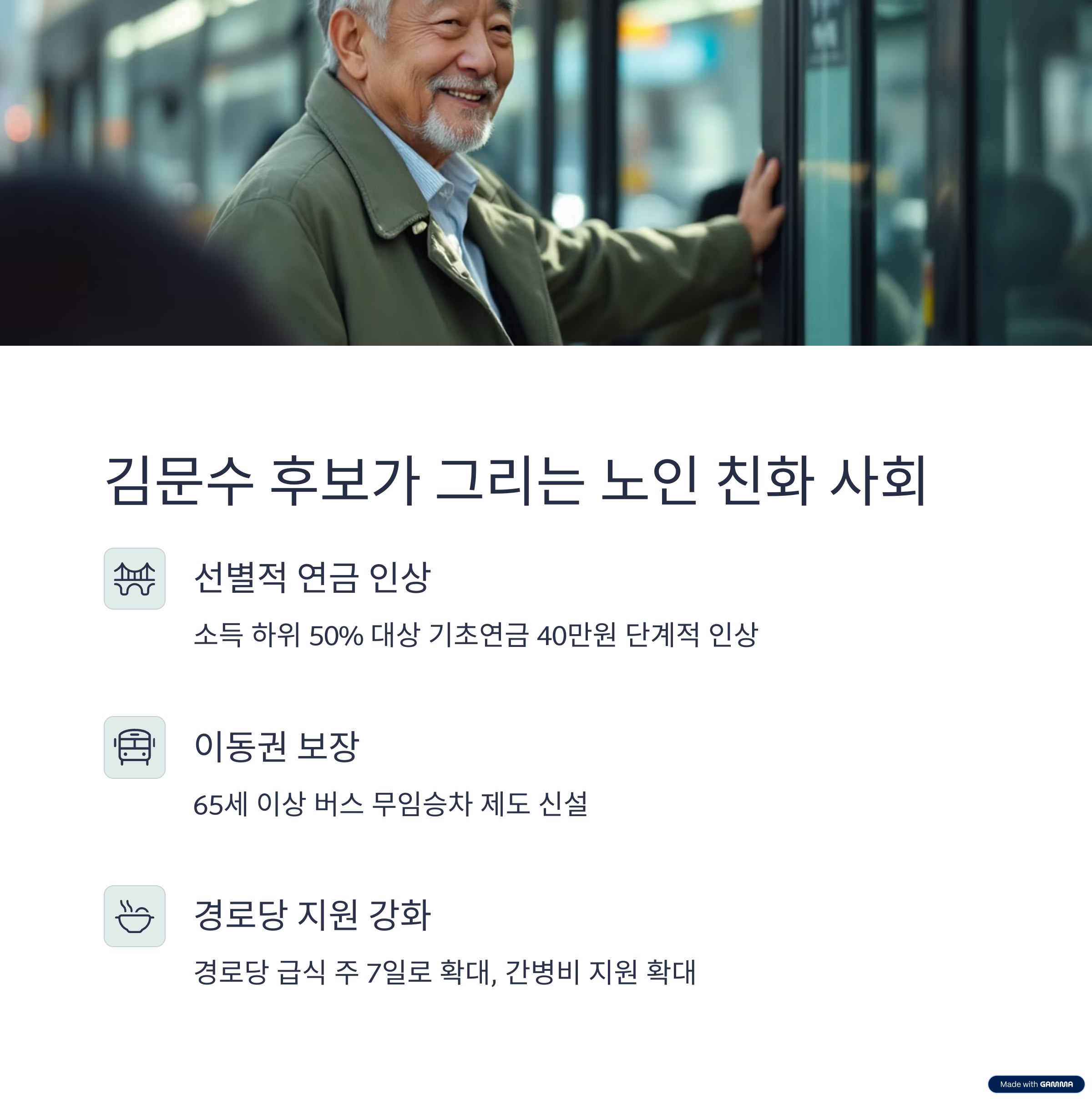 김문수 후보는 일상비용 절감을 핵심으로, 65세 이상 버스 무임승차 제도를 신설하고, 경로당 급식도 주 7일로 확대하겠다고 밝혔습니다. 가족 간병인에게 월 50만 원을 지급하는 정책은 간병 부담을 가족이 전적으로 떠안고 있는 현실에서 큰 반향을 일으킬 수 있습니다.